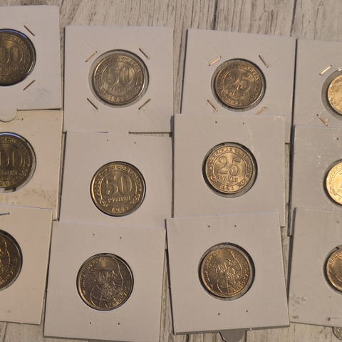 Alle har tydelige detaljer og lesbare årstall, men med normal slitasje, små hakk og bruksspor – typisk for denne typen mynter.