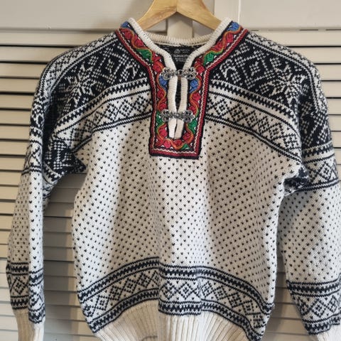 Dale of Norway genser i ull for dame i størrelse S. Genseren er hovedsakelig hvit med tradisjonelt norsk mønster i mørke kontrastfarger og dekorert halsåpning med bånd og hekter. Strikket i ull, egnet som varm hverdagsgenser eller til fritidsbruk.