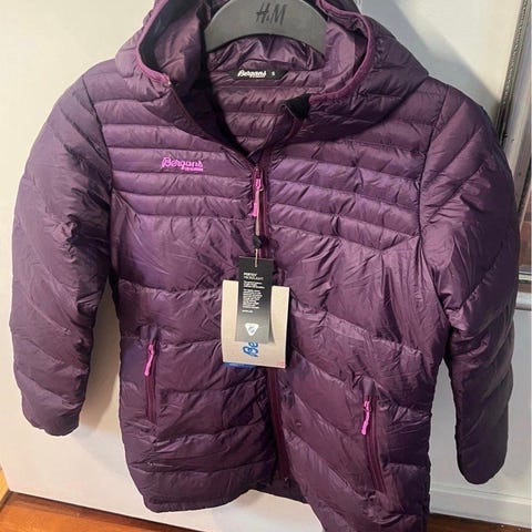 - Mørkelilla farge, størrelse small. Har ikke noen feil, flekker osv, men har noen få små hull hvor det kan lekke ut dun.
