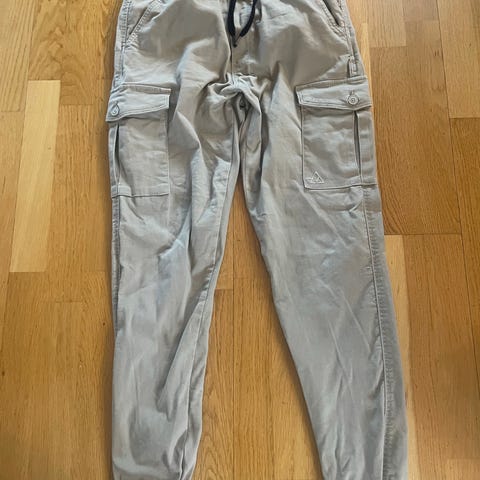 Blå cargobukse med strikk nederst på beina. Buksen har flere lommer på sidene av bena og vanlig linning i livet. Passer til hverdagsbruk eller fritidsaktiviteter der det er behov for praktiske lommer og behagelig passform.