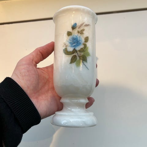 Selger en liten vase i grønn marmor. Det er et like hakk i toppen av vasen (se bilde). Diameter: 4 cm