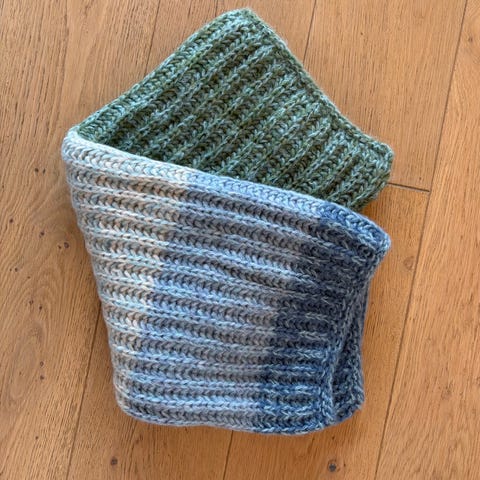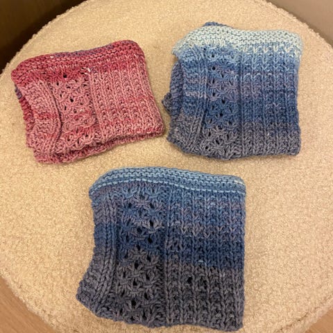 Mininøstene à 10gram med 100% bomullsgarn i forskjellige farger var tiltenkt hjemmestrikket kosedyr til barnebarn, men ønsket dyr ble stadig endret, så da ble nøstene strikket til 2 gode oppvaskkluter istedenfor..