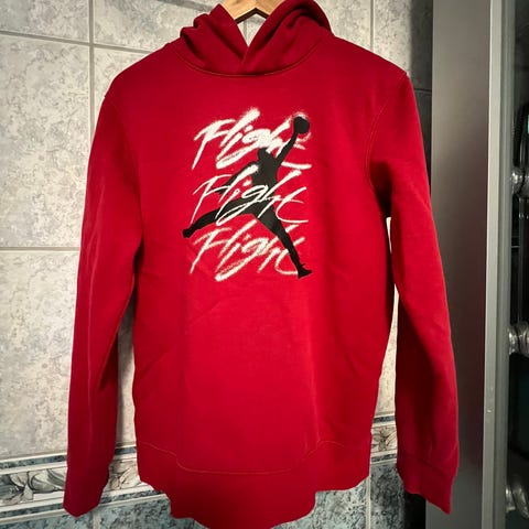 Nike Air hettegenser for barn i størrelse 116. Hettegenseren er rosa og laget i bomull. Modellen er til jente og har hette og lange ermer. Fronten har stort «AIR» trykk med Nike-logo. Passer til hverdagsbruk og fritidsaktiviteter.