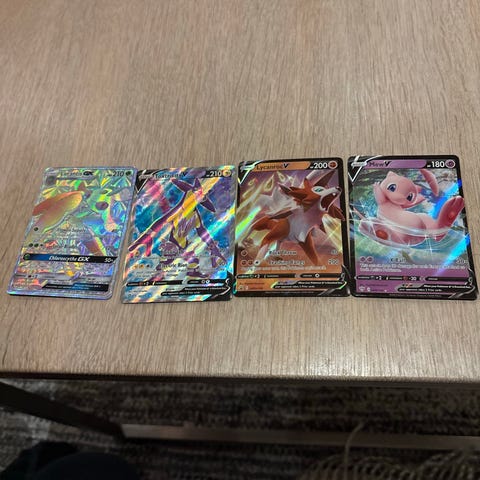 Pokémon samlekort lot med 7 kort. Kortene ligger i plastlommer/beskyttere.