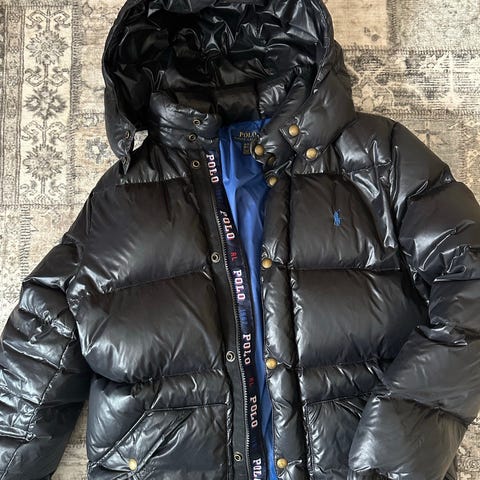 Moncler dunjakke i svart. Klassisk, vattert modell med blank overflate og høy krage. Jakken har glidelåslukking foran og justering nederst. Lomme med klaff og logo på ermet. Innvendig finnes karakteristisk Moncler-tegneserieetikett og merkelapp med QR-kode. Passer som ytterjakke i kaldere vær.