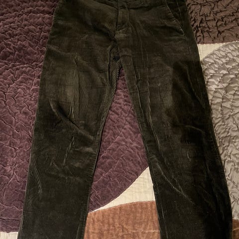 COS bukser for herre i størrelse M. Buksen er i grønn cordfløyel. Passer til hverdagsbruk eller mer formelle anledninger avhengig av styling. Materialet cordfløyel gir et mykt uttrykk og struktur i stoffet. Klassisk modell med beltehemper og lukking foran.
