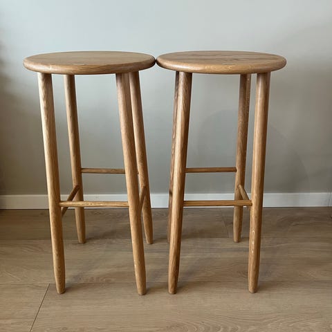 NB! Noe flising i treverket (fra produksjon) og en sprekk ved det ene benet på den ene krakken (forårsaket i frakt). Se bilder!