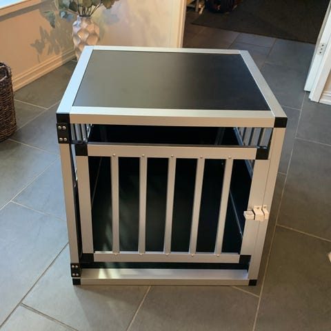 Hundebur i aluminium med mål ca. 48 x 64 x 54 cm. Buret har skrå bak- og frontside som gjør det egnet for plassering i bilens bagasjerom. Det har dør med gitter i front, solide plastforsterkede hjørner og tette sideplater. Leveres med pute/madrass i bunnen for økt komfort for hunden. Passer til mindre hunderaser, avhengig av hundens størrelse og behov for plass.