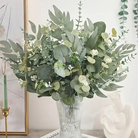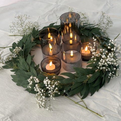 Har en haug med blå kunstige blomster kjøpt på rusta i 2024, de ble brukt til pynt i dåp.
