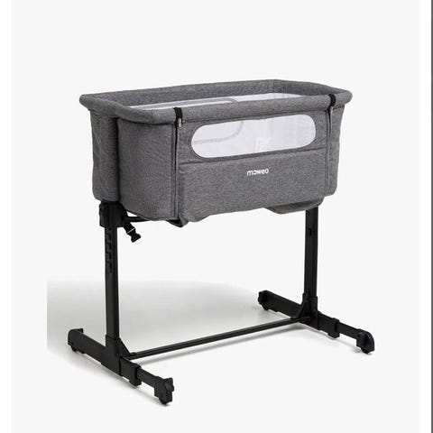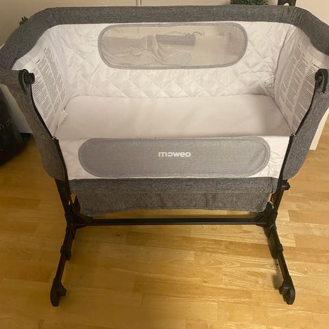 Moweo bedside crib babyseng i grå tekstil. Sengen er utformet for å stå inntil foreldreseng og har justerbar høyde. Den har nettingfelt på siden for bedre lufting og innsyn til barnet. Stabil ramme med hjul gjør det enklere å flytte sengen mellom rom ved behov. Egnet som soveplass for spedbarn i den første perioden.