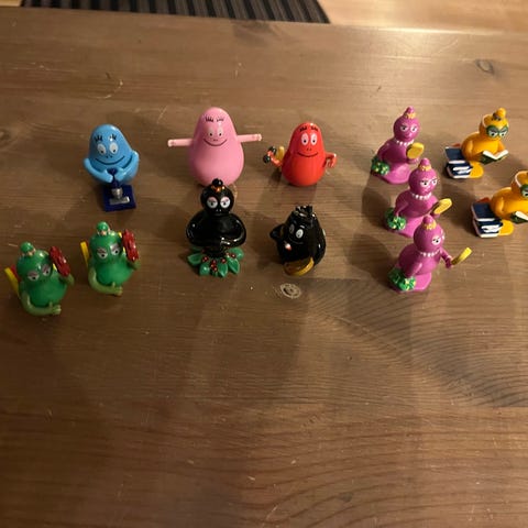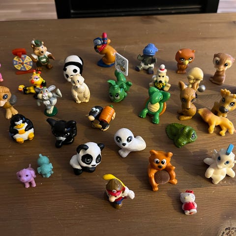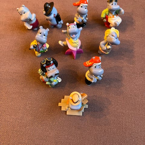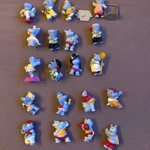 Selger en samling av Kinder Surprise happy hippo figurer.