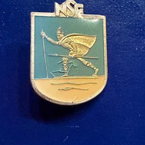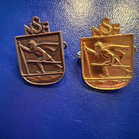NSF skimerke pin i metall. Nålen har relieffmotiv av skiløper med stav og kappe innenfor et skjold, med bokstavene NSF øverst. Baksiden har nål og festeanordning i metall for bruk på klær eller utstyr. Egner seg som samlerobjekt eller til bruk på jakke, lue eller sekk.