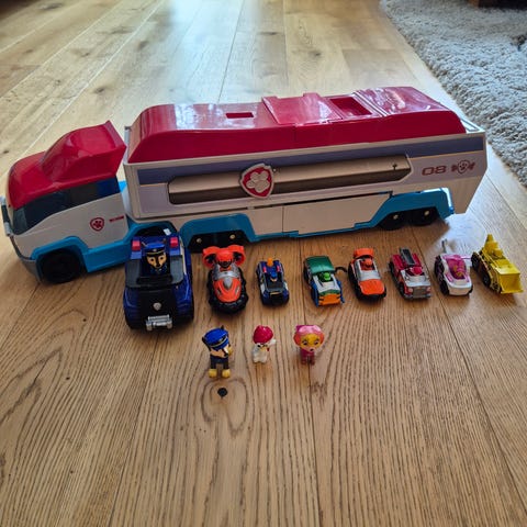 Selger denne pent brukte Paw Patrolleren med fullt sett med biler, Ryder, robohund og en liten Liberty figur.