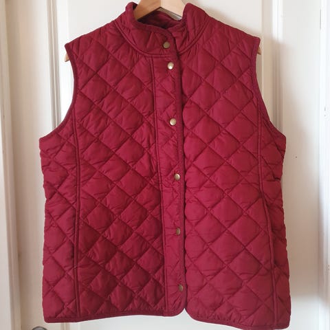 Gant vest til dame i størrelse xl. Vesten er mørk rød med syntetisk quiltet utside og for bomull. Passer som et ekstra lag over genser eller skjorte i overgangssesonger eller på kjølige dager.