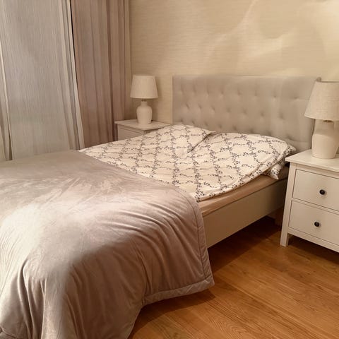 IKEA Birkeland seng 180x200 med hodegavl, 2 Svane madrasser og 2 Hemnes nattbord