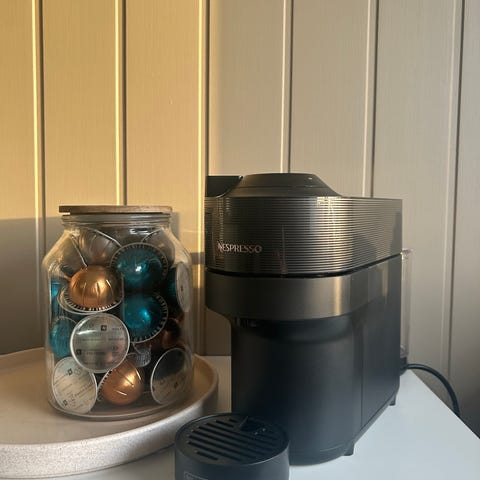 Kaffemaskinen bruker Nespresso Vertuo-kapsler og er beregnet for tilberedning av kaffe og espresso i ulike koppstørrelser. Maskinen har koppbrett i front og vannbeholder plassert bak. Utførelsen er kompakt og egner seg for plassering på kjøkkenbenk eller lignende flate. Fargen er helsvart med Nespresso-logo i front.