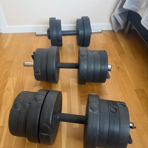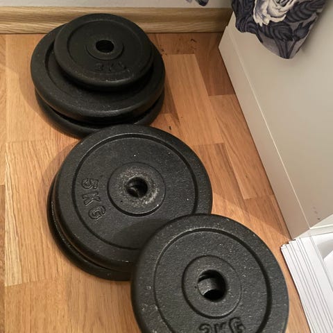 Vektskiver: 4 x 3,4 kg, 4 x 1,15 kg og 4 x 0,5 kg. Vektskivene på 3,4 kg og 1,15 kg er laget av betong og dekket med hardplast for å beskytte gulvet. Vektskivene på 0,5 kg er laget av jern. 2 manualstenger med 4 låseklyper. Totalt 21 kg. Prisen gjelder for begge manualene samlet.