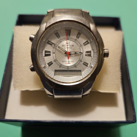 Casio Edifice Wave Ceptor herreklokke i rustfritt stål. Klokken har analog og digital visning med mørk urskive og markeringer i blant annet rødt og hvitt. Lenkens ledd og kasse er i metall, med foldespenne merket Casio. Baksiden er merket med Edifice-logo og Wave Ceptor, samt informasjon om radiokontrollert tid, verdensur-funksjon og vannbestandighet. Egnet som hverdagsklokke til herre.