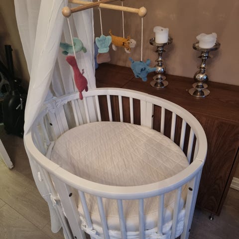 Stokke madrass til barneseng. Oval madrass som passer til Stokke barneseng, i lys farge.