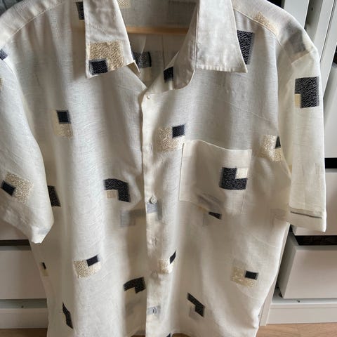 Junkyard Yoke skjorte for herre i størrelse M. Kortermet skjorte i hvit lin med krage og knappelukking foran. Skjorten har broderte motiver foran og bak. Materiale ifølge merkelapp er hovedsakelig lin. Passer som lett og luftig overdel til hverdagsbruk eller sommerbruk.