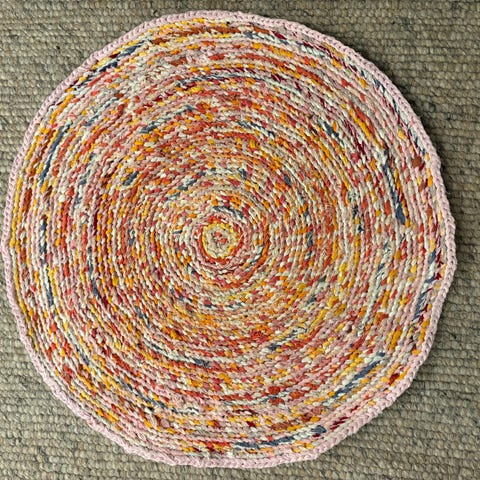 Rundt teppe heklet for hånd. Kjøpt av meg på Finn til barnerommet, men fargene ble litt feil.