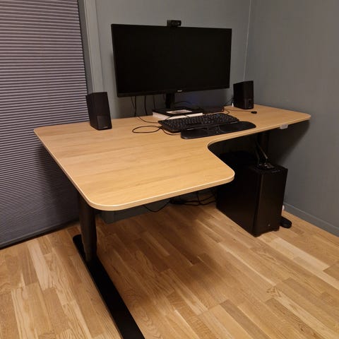 Gir god plass til skjermer, tastatur og annet kontorutstyr, og passer til hjemmekontor eller arbeidsrom. Kabler kan føres under bordet på hev/senk understellet.
