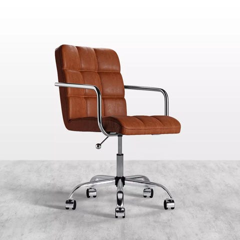 JUEL leveres i brun skinnimitasjon, med krom armlene og V-mønstret rygg og sete.