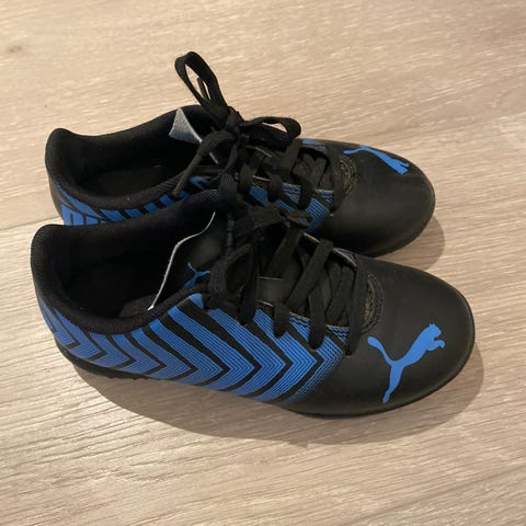 Puma fotballsko for barn, unisexmodell i svart med blå detaljer. Skoene har snøring foran og knotter under sålen som gir feste på gress- eller kunstgressbane. Overdelen er i syntetisk materiale som er lett å holde rent. Egnet til fotballtrening og lek utendørs.