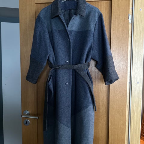 kåpe for dame i størrelse 44. Kåpen er grå med rutemønster og har med fôr på innsiden for økt komfort.