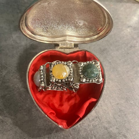 Farge: Sølvfarget metall med dype, mørke krystallsteiner som fanger lyset.