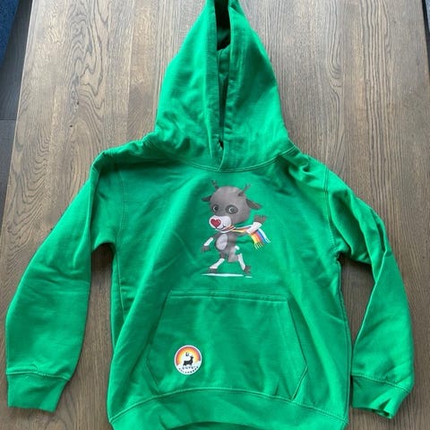 Mini Rodini genser for barn i størrelse 116-122. Genseren er grønn og laget i bomull, med halv glidelås i halsen. Den har E.T motiv på brystet og striper i rødt og gult på ermene. Unisex-modell som passer både gutter og jenter, Nypris 800,-