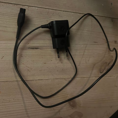 Strømkabel adapter i svart farge. Kabelen har vanlig to-pins støpsel i den ene enden og apparatkontakt i den andre enden, egnet for tilkobling av elektrisk utstyr til strømnett. Passer til enheter som bruker tilsvarende kontaktstandard. Lengden på kabelen er ikke målt, men den fremstår som en standard nettledning for innendørs bruk.
