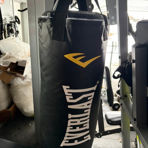 Boksesekken er en hengende sekk fra Everlast i svart med hvit logo og gule detaljer. Egner seg til boksetrening og slagøvelser hjemme eller på treningsrom.