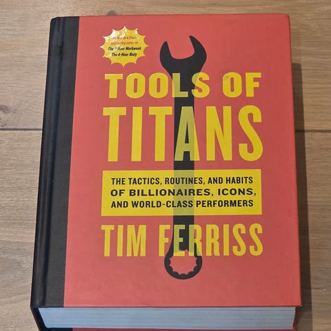 Tim Ferriss Tools of Titans bok i paperback-utgave. Boken er på engelsk og samler taktikker, rutiner og vaner fra ulike profiler innen blant annet business, idrett og underholdning. Utgitt av Vermilion. Formatet er pocket med mykt omslag og trykt tekst på rygg og omslag.