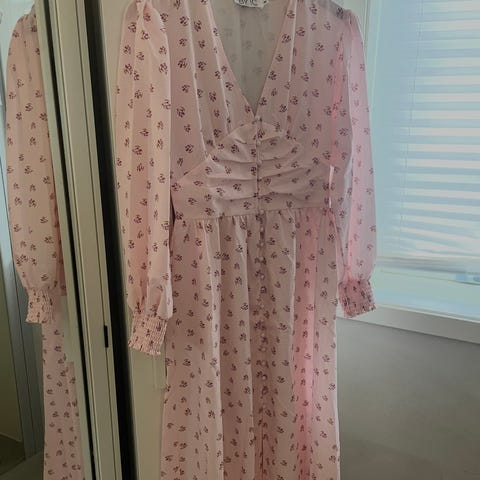 BYIC sommerkjole for dame i størrelse S. Kjolen er rosa med mønster og laget i polyester. Den har lange ermer, markert midje og knepping foran i overdelen. Lengden er midi til lang, egnet til bruk vår og sommer.