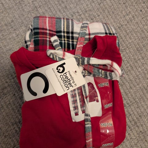 Cubus pysjamas i bomull for barn/unisex i størrelse 158. Overdel i ensfarget rødt og bukse med rutete mønster. Passer som nattøy eller koseklær hjemme. Materiale: bomull.