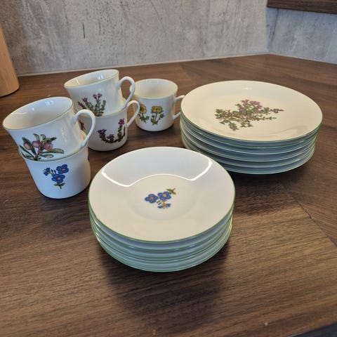 Pene sett med motiv Greplyng i serien fjellflora fra Porsgrund porselen. Diameter asjett 17 cm. Selges 90,- 3 deler. Kopp/ skål 60,- asjett 40,- Sender post. Har alle 12 varianter.