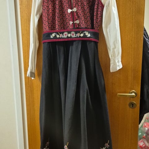Selger min gode og komfortable festdrakt pga overgang til ny. Denne festdrakten har blitt pent brukt ved noen få anledninger. Foran på brystet så pyntes drakten med en kjetting, og langs livet festes et belte med en tilhørende veske med romslig plass. Festdrakten er i str.S og skjørtet treffer anklene. Jeg er 1.72 cm lang