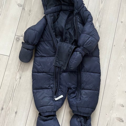 KappAhl kjeledress for baby i størrelse 68, unisex. Kjeledressen er svart. Modellen har hette og hel glidelås foran for enkel av- og påkledning. Polstret og vattert for å gi god varme. Passer til baby rundt 4–6 måneder, avhengig av barnets størrelse.