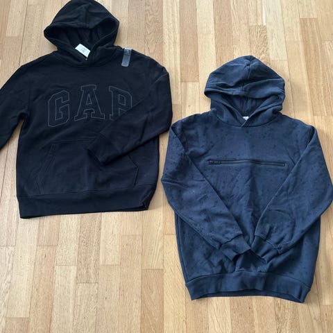 To, en grå og en mørkeblå, fint brukte hettegensere selges samlet for 150 kr