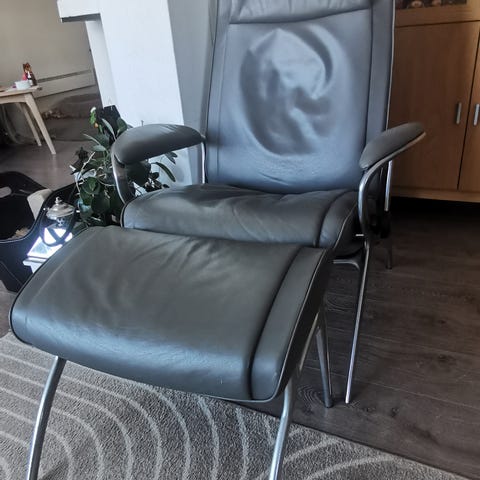 Fin Conform svingbar lenestol med fotskammel. Begge i sort skinn.