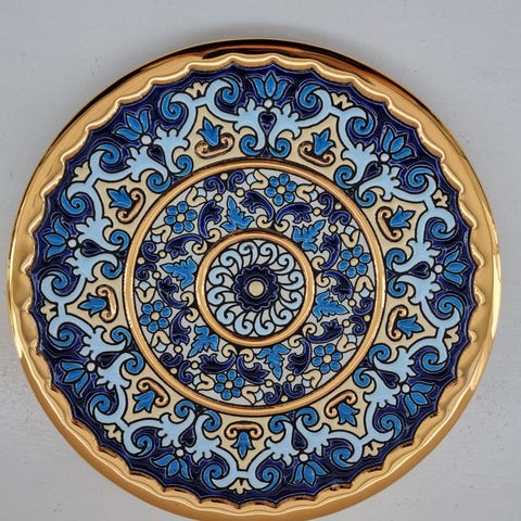 Fatet er rikt dekorert med tradisjonelle greske blomstermotiver i flotte røde, blå og grønne farger, kombinert med elegante detaljer i 24 karat gull langs kanten. Et ekte blikkfang som passer perfekt som veggdekor eller som dekorativt fat på bord eller i vitrineskap.