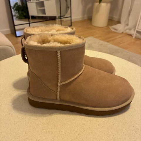 Selger pent brukt UGG støvler i størrelse 37. Sko er kun brukt en gang av min datter. Modellen er ankelhøy med kraftig platåsåle. Støvlene er laget i brunt semsket skinn med mykt, lyst fôr på innsiden. Grovmønstret yttersåle i gummi gir godt grep. Nøytral og enkel modell som passer til hverdagsbruk i kaldere vær.