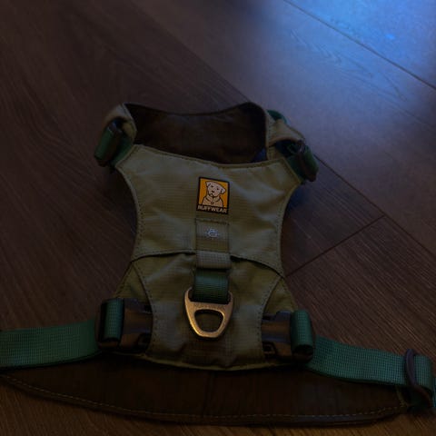 Diverse hundeutstyr, seler, regndresser, redningsvest og matskåler