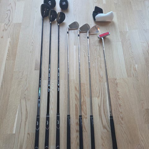 Orginalt sammensatt av Sand Wedge-, Pitch-, 9-, 8-, og 7er jern. Driver, 5er-wood, hybrid og putter.