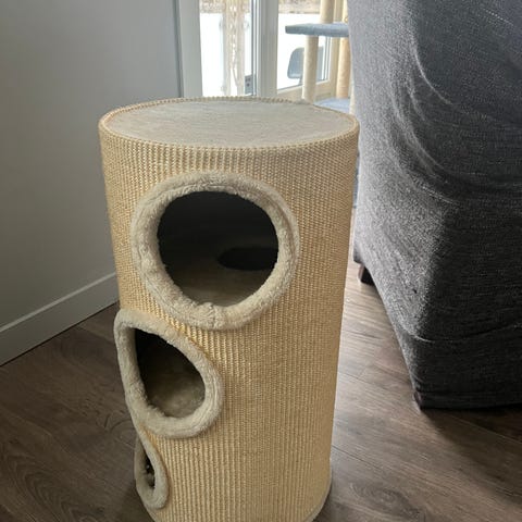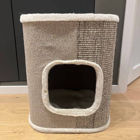 Klatretønne for katt med ytre kloreflate i sisal og innvendig liggeplass. Tønnen er laget i treverk med rund åpning i den ene enden og polstret, myk pute inni for komfort. Egnet som kombinasjon av kloremøbel og hvileplass for katt, og kan plasseres på gulv i stue, gang eller andre rom der katten oppholder seg.
