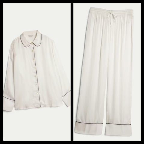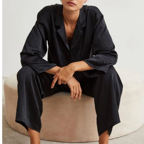 Hentet bilde og tekst fra HM sin nettside: En pyjamas med langermet skjorte og bukse i myk, viskoseblandet trikot. Skjorte med krage, slag og knapper foran. Bukse med trukket elastikk i midjen og vide, rette ben.
