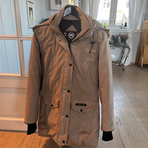 Canada Goose dun vinterjakke for dame i størrelse S. Jakken er beige og vattert med dunfyll. Den har hette med pelskant, gjennomgående glidelås foran og flere ytterlommer. Ribbestrikkede mansjetter i ermene gir ekstra isolasjon. Canada Goose-logo på ermet. Egnet som varm vinterjakke i kaldt vær. Selges da den blir lite brukt og er litt mindre i strls, passer xs-s (eventuelt m med tynne klespagg under)