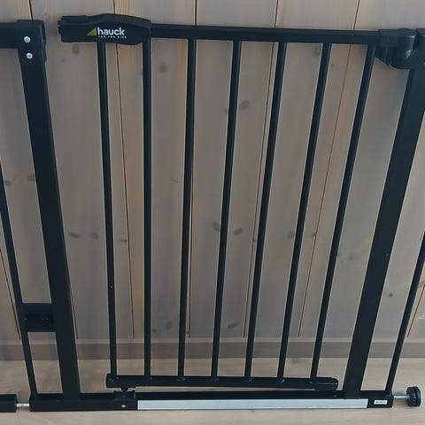 Hvit trappegrind selges. Bredden kan justeres fra Ca 75 cm til 87 cm. Som du ser på bilde nr 2 så medfølger alle fire skruene men den ene gjengen er borte.
