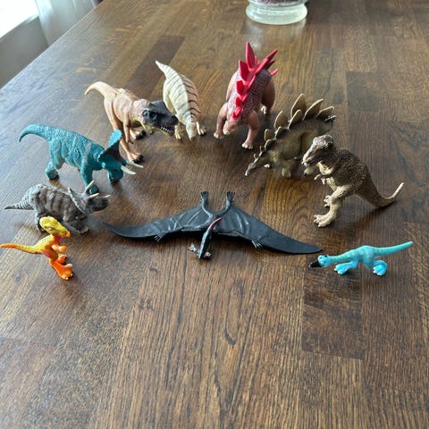 Dinosaurfigurer lekedyr i plast. Flere ulike dinosaurarter i forskjellige størrelser og farger. Figurene kan brukes til rollelek, samling og som tilbehør til andre lekesett. Passer for barn som liker dinosaurer og fantasifull lek. Masse lek igjen, selges samlet.